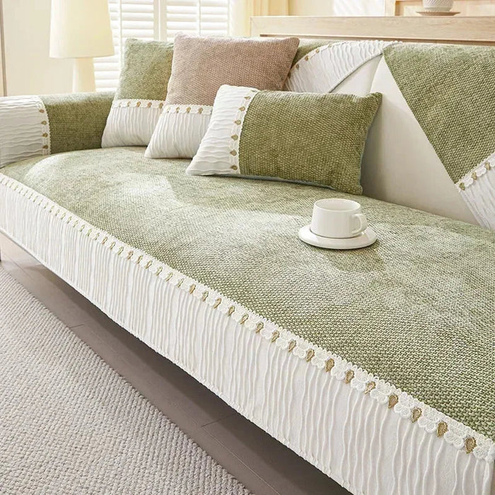Capa para Sofá Chenille Antiderrapante com Bordado Floral Verde